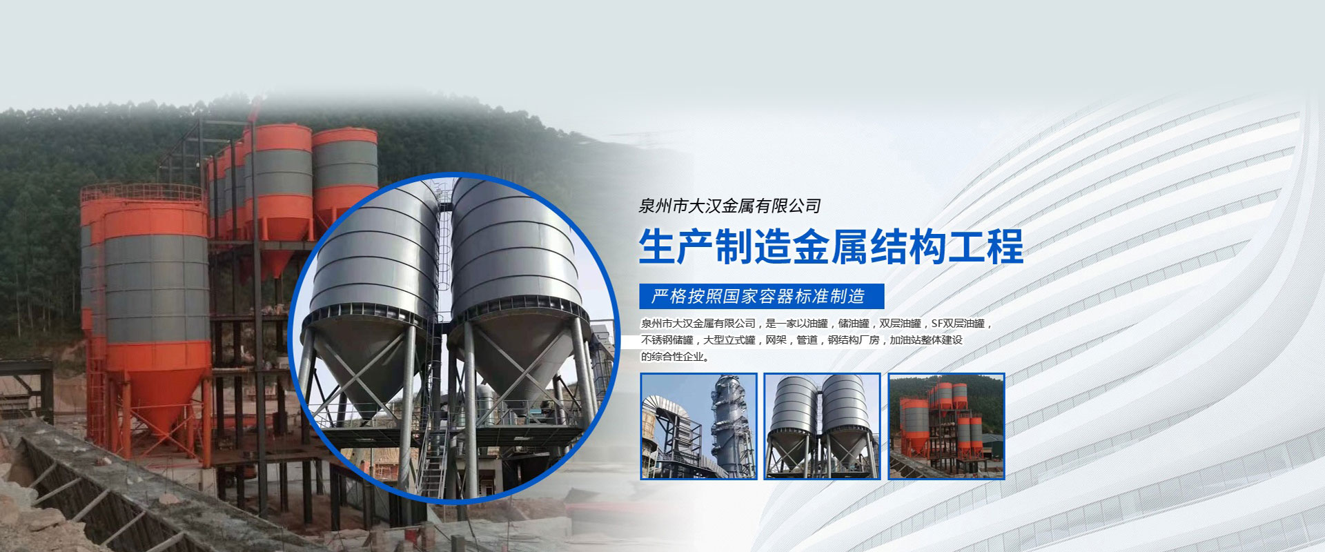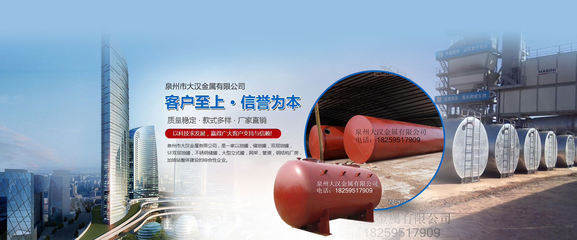 泉州市大漢金屬有限公司,是一家以油罐、儲(chǔ)油罐、雙層油罐、SF雙層油罐、不銹鋼儲(chǔ)罐、大型立式罐、網(wǎng)架、管道、鋼結(jié)構(gòu)廠房、加油站整體建設(shè)的綜合性企業(yè)。本公司以技術(shù)人員、施工經(jīng)驗(yàn)豐富的工程隊(duì)、自動(dòng)化設(shè)備、擁有鋼結(jié)構(gòu)建筑、螺栓球網(wǎng)架設(shè)計(jì)安裝技術(shù)力量,嚴(yán)格按照國(guó)家容器標(biāo)準(zhǔn)制造,是一家產(chǎn)品開(kāi)發(fā)并生產(chǎn)各種壓力容器和制造金屬結(jié)構(gòu)工程,化工石油工程安裝的大型企業(yè)。近多年來(lái),以質(zhì)量穩(wěn)定、客戶至上、信譽(yù)為本,以科技求發(fā)展,贏得廣大客戶支持與信賴(lài)。